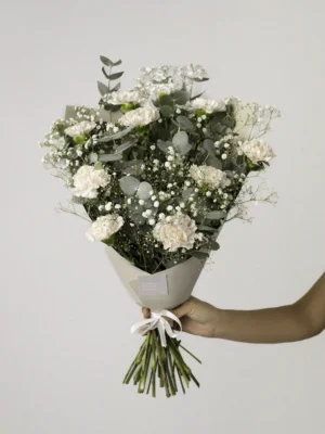 Švari žalia-balta estetika, pagardinta subtiliais prieskoniais. Puokštės kuriamos maišant ne spalvas, o tekstūras.