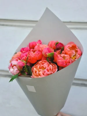 Prabanga ir švelnumas viename – sodrių rožinių ir koralinių atspalvių bijūnų puokštė, kuri užburia savo natūraliu grožiu ir žavesiu. Nuotraukoje matote puokštę su 15 žiedų.