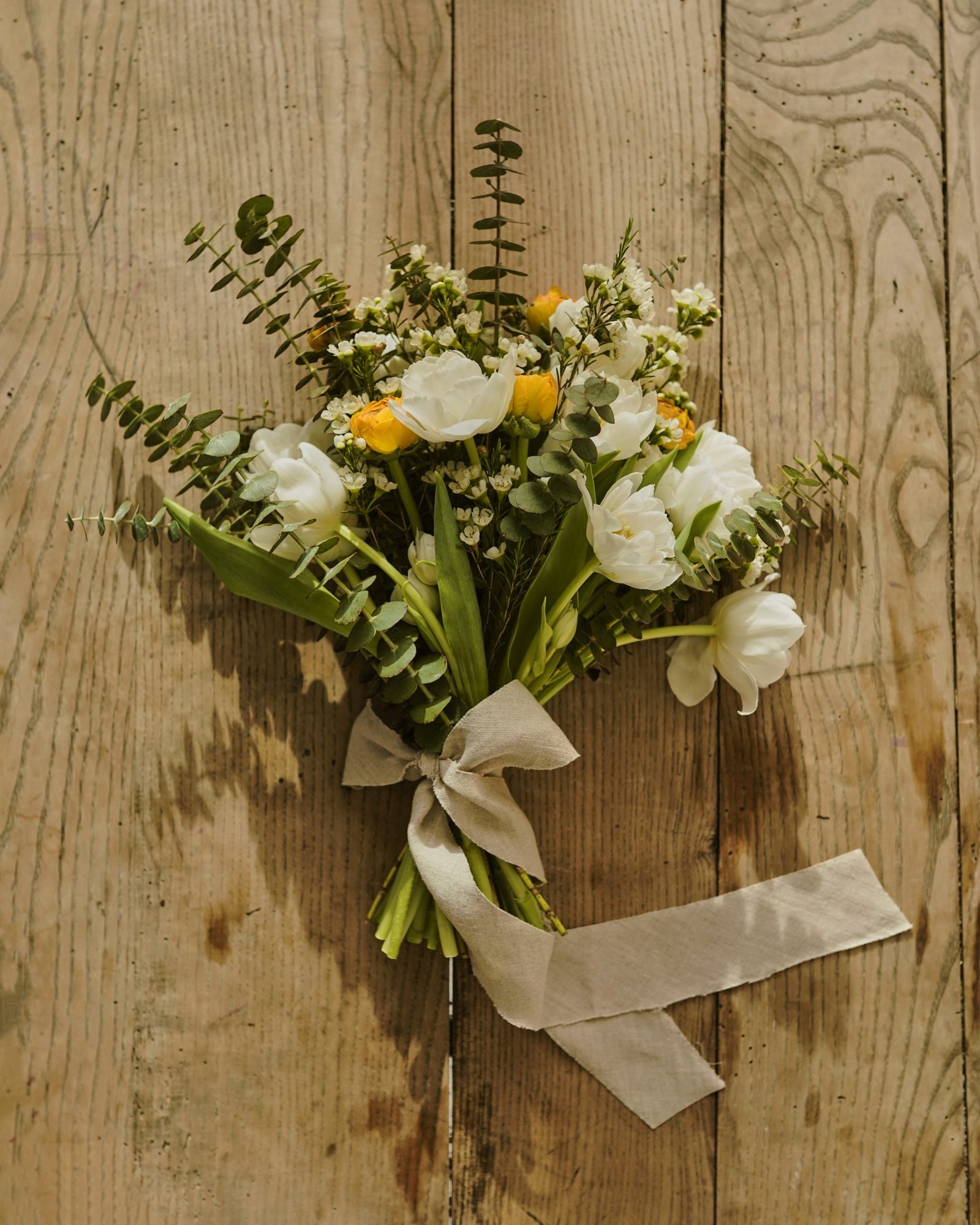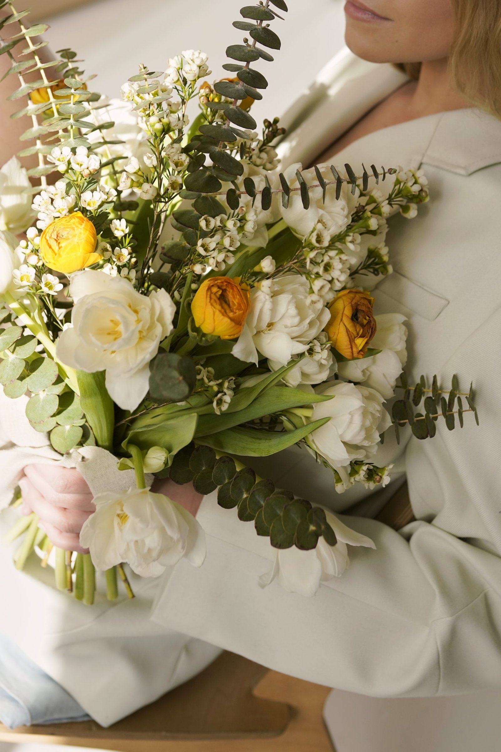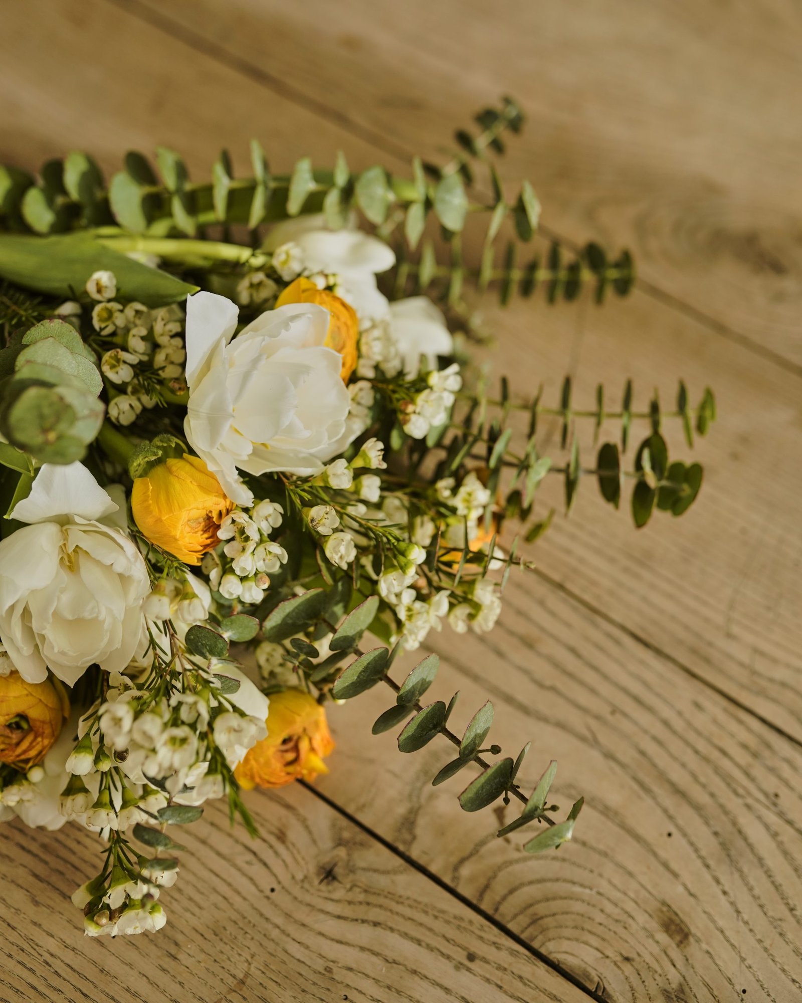 Vegetatyvinė gėlių kompozicija susidedanti iš ranunkulų (liet. Vėdrynai), tulpių, vaškagėlės ir eukalipto.