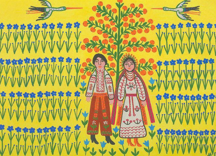 Puokštė sukurta pagal Ukrainos dailininkės Marijos Primačenko paveikslą ,,Žydi linai, nuotaka eina pas savo jaunikį”.