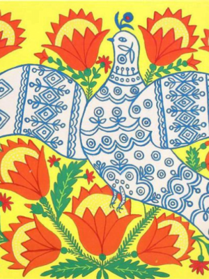 Puokštė sukurta pagal Ukrainos dailininkės Maria Primachenko paveikslą „Balandis išskleidė sparnus ir prašo taikos”